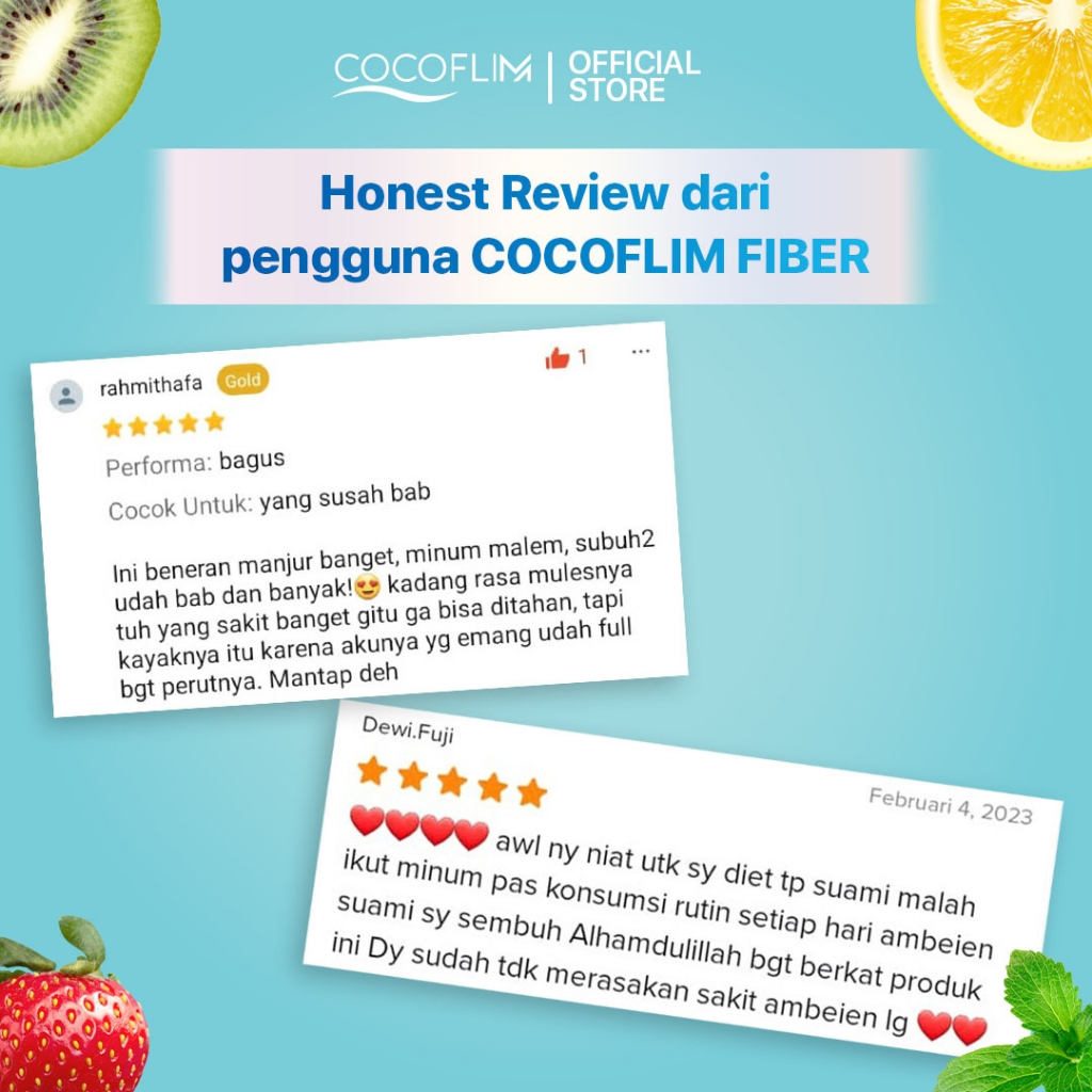 Kenapa harus minum Cocoflim Fiber? • Cocoflim kaya akan antioksidan dan Tinggi Serat (10 gram serat per sachet) yang bisa memenuhi kebutuhan serat dalam tubuh. • Cocoflim sangat membantu untuk menurunkan berat badan • Kandungan Ingredients Terlengkap dibanding merk lain • Dibuat sepenuhnya dari bahan-bahan alami • Sudah BPOM & Halal dari MUI. • Dibuat dalam bentuk sachet sehingga sangat praktis untuk dibawa kemanapun anda pergi. • Kandungan cocoflim bisa memenuhi 100% Vitamin C untuk tubuh.