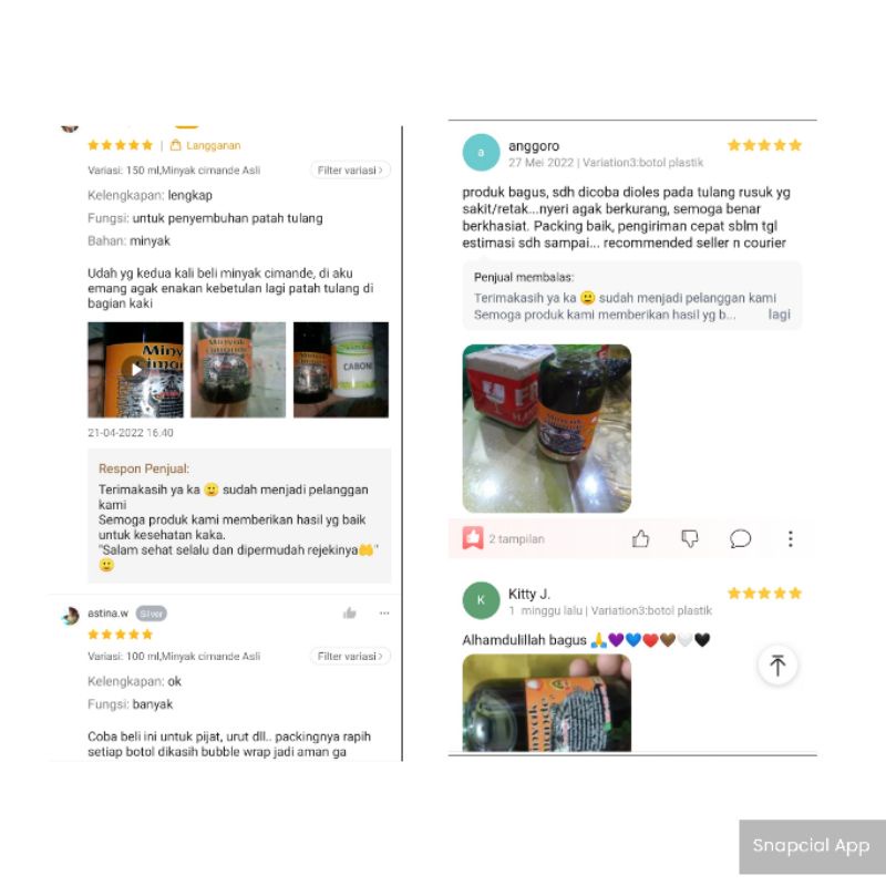 Assalamualaikum selamat datang di toko kami, Kami adalah penjual pertama minyak cimande dari talang Bogor untuk keaslian sudah jelas asli 100 % dan pastinya tutupnya bersegel yah kak.. palet 4 botol 50 ml produk yg kami jual Alhamdulillaah 100% minyak asli cimande yg sudah dibacakan doa2 )khusus (asma Allah) yg telah terbukti sejak jaman dahulu Manfaat / kegunaan menghilangkan keluhan pada gangguan tulang seperti : - Patah Tulang (mempercepat proses pemulihan) ) - Bengkak yang disebabkan benturan/pukulan. - Rasa sakit / nyeri pada cidera lama (bekas luka/benturan/tabrakan) - Rasa sakit / nyeri pada persendian tulang kaki/lengan maupun punggung - Mencegah / memperlambat proses pengeroposan tulang terutama pada usia lanjut. ##-untuk terapi penyembuhan stroke - Mencegah / mengurangi rasa sakit karena benturan pada olah raga bela diri (pencak silat, karate, dll) sebagai obat penyembuhan patah tulang,keselleo,memar,kekilir,penyembuhan luka bakar dll dan untuk menjaga kesehatan tubuh .. bila diminum ..sehari 2x sendok teh atau bisa juga sebagai obat terapi untuk anak yang sedang belajar berjalan kaki dengan cara dibalurkan pada kaki si anak rutin..insya allah tulang si anak akan lebih kuat dan bisa lebih cepat untuk berjalan ...