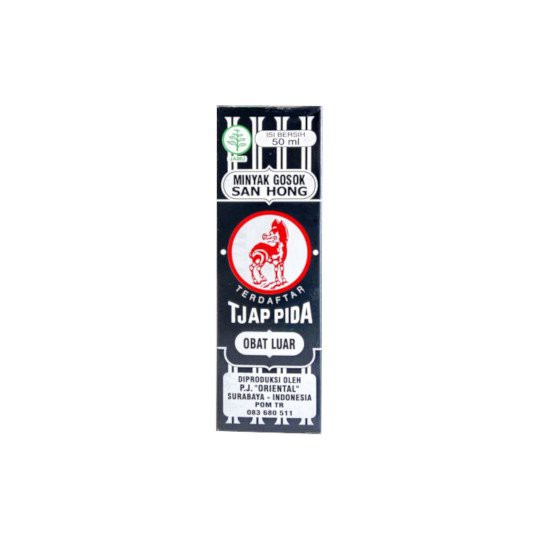 Minyak Sanhong Cap Pida terbikin dari sarinya obat Hweetan (ilmu obat tusukan api) menurut resepnya Beng-le (professor) Kung Yun Lin,kekuatannya dengan sekejap bisa meresap sampai ditulang hingga banyak penyakit bisa ditolong dalam tempo brapa jam bila aruran pakainya diturut dengan betul.Sesuatu penyakit yang bisa lekas disembuhkan dengan pertolongannya ini minyak,boleh priksa aruran pakainya dan perhatikan di waktunya pakai. Sesuatu orang akan bisa merasa heran dari kemustajabannya ini minyak bila dibikin perbandingan dengan lainnya minyak gosok. ATURAN PAKAINYA JANGAN SAMPAI KELIRU : RHEUMATIEK,(ENCOK),GRINGGING,LINU ini minyak gosokkan atau urutkan di tempat sakit. Dan penyakit Encok dilarang minum ten dan es.LUKA KENA GAMAN BERACUN,DIGIGIT BINATANG BERBISA lebih dahulu jangan kena air lantas ini minyak tutulkan kapas dan dibungkuskan dan sehari diganti sekali: DIGIGIT KELABANG ATAU KALAJENGKING bungkus dengan ini minyak, dalam 15 menit sakitnya lenyap dan sembuh. minyak 3 jam sekali.KENA AIR PANAS,KEBAKAR API, BAD AN SERING GATEL,poles dalam 2 jam sekali.KADAS BIASA ini minyak campurin sedikit tawas,poleskan 3 jam sekali. BENGKAK INFEKSI ini minyak dieampur dengan nyalinya Biruwang dan dipoleskan 3 jam sekali.LUKA-LUKA LAMA tiap 3 jam poleskan sekali. KORENG,EXCEEM,KAKI RANGEN,TANGAN CANTENGEN ini minyak dipanasi dan waktu panas dioleskan di tempatnya sakit.SAKIT GIGI ini minyak campur sedikit camfer dengan kapas masukkan dalam lobang gigi.SAKIT PULUNG HATI,SAKIT PERUT ini minyak kerikan dan gosokkan di tempatnya sakit lantas tutup dengan selimut atau kain panas.PINGSAN LANTARAN MASUK ANGIN gosokkan antero badan atau dikerikan.BATUK MASUK ANGIN gosokkan dada dan geger. TRACHOOM (PINGGIR MATA MERAH,MERINTIS DAN GATEL) ini minyak dioleskan di pinggir mata sehari 4 kali. BANYAK KENCING DIWAKTU MALAM gosokkan di bawah puser. PEREMPUAN HABIS BERANAK gosokkan pinggang dan kaki bisa menjaga penyakit kaki linu atau lumpuh. PIJAT, URUT, DAN KERIK-KERIK juga baik pakai ini minyak untuk mengeluarkan angin dan membaikkan urat-urat. KOMPOSISI : - Zingiber 13% - Officinale Zyzycium 5 % - Aromaticum 10% - Gymbopogonis 10% - Burmani Cortex Cocos 50% - Nucifera 2,5% - Foeniculum Vulgare 100%