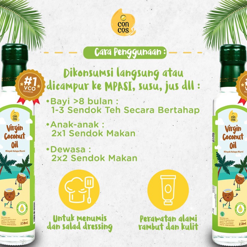 Concos Virgin Coconut Oil Kids merupakan 100% minyak kelapa murni organik dengan kandungan utama asam laurat ini memiliki sifat antibiotik, anti bakteri dan jamur. Metode esktraksi consos adalah Cold Pressesed dan tanpa pemanasan ataupun tambahan kimia.