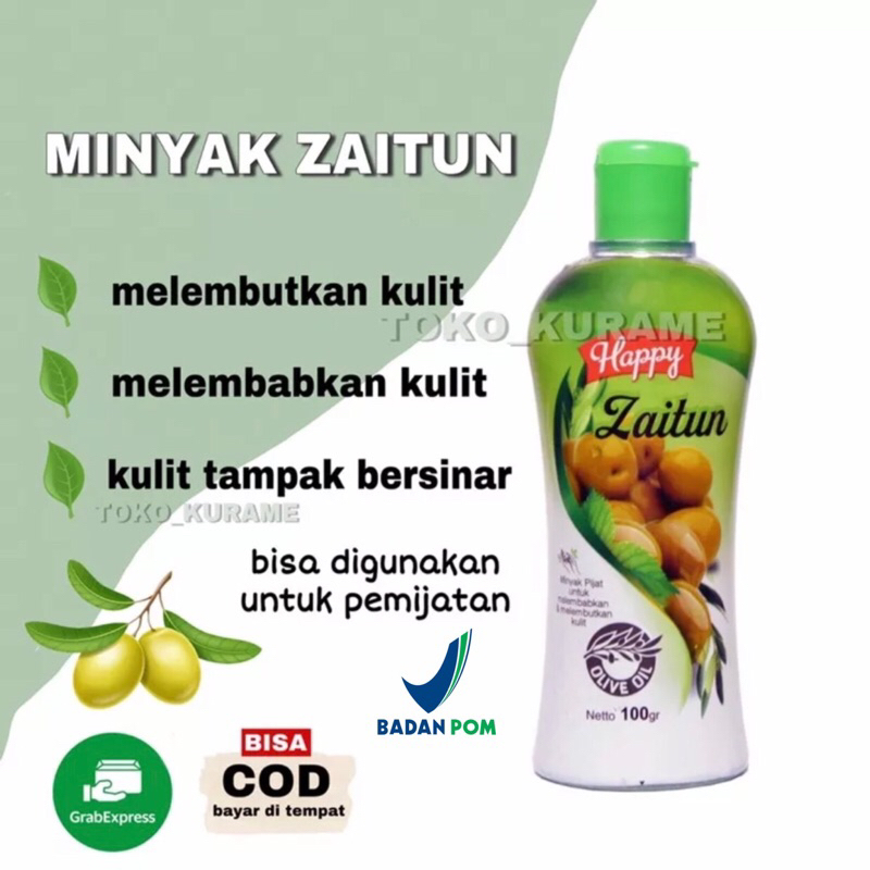 Happy Zaitun minyak zaitun membantu melembabkan kulit kering agar terlihat lebih halus, lembut dan tampak bersinar, juga bermanfaat sebagai perawatan kulit badan dan untuk pemijatan