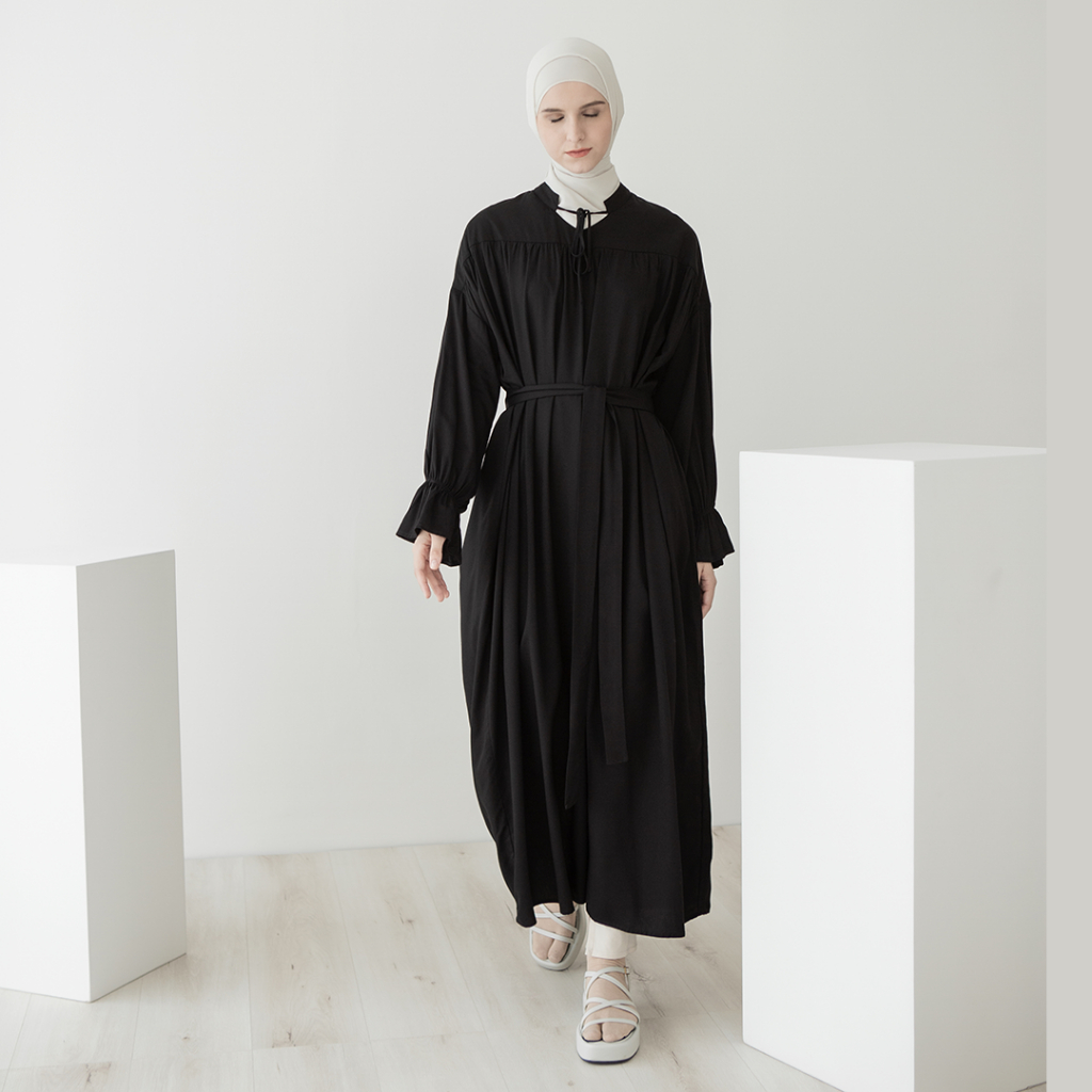 Detail Mira by Aska Label - Gamis wanita Muslim dress wanita bahan rayon premium details kerut warna beige, dusty blue, dark blue navy, hitam black
