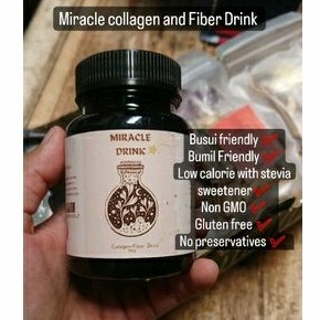 Minuman collagen dan serat dengan clean ingredients, mengandung pemanis alami stevia yang mana kebanyakan minuman colagen di pasaran mengandung gula jagung yang sarat dengan GMO (GENETICALLY MODIFIED ORGANISM), Miracle drink ini benefitnya adalah High Fiber, LOW CALORIE, tanpa pengawet dan artifisial sweetener/ collorant dan gluten free, BUMIL dan BUSUI FRIENDLY.