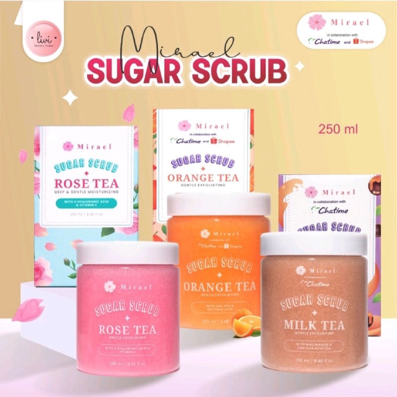 MIRAEL SUGAR SCRUB Tersedia dalam 3 Varian : 1. MIRAEL X CHATIME Limited Edition Milk Tea No BPOM: NA18220700127 Milk Tea Sugar Scrub dilengkapi dengan Niacinamide & Ekstrak Centella Asiatica. Membantu mengeksfoliasi kulit mati dan melembutkan serta membantu mencerahkan kulit. Eksfoliasi 3 hari sebelum waxing dan 3 hari setelah waxing dapat menghaluskan kulit, mengangkat sel kulit mati sehingga mencerahkan dan mencegah ingrown hair Manfaat: 1. Kandungan minyak alami mampu menutrisi kulit selama 24 jam. 2.Eksfoliasi kulit secara lembut dengan hasil maksimal dengan kandung minyak Avocado Oil, Argan Oil, Macadamia Seed Oil, Olive Fruit Oil 3. Collagen yang terkandung mampu mengencangkan kulit. 4. Pemakaian rutin bantu kulit tampak lebih cerah.4. Pemakaian rutin bantu kulit tampak lebih cerah.4. Pemakaian rutin bantu kulit tampak lebih cerah. 2. MIRAEL Rose Tea Sugar Scrub No BPOM: NA18220700076 Rose Tea Sugar Scrub dilengkapi dengan kandungan 4 Hyaluronic Acid & Vitamin E mampu menghidrasi kulit dengan maksimal. #7harimandiskincare Eksfoliasi 3 hari sebelum waxing dan 3 hari setelah waxing dapat menghaluskan kulit, mengangkat sel kulit mati sehingga mencerahkan dan mencegah ingrown hair Manfaat: 1. Kandungan minyak alami mampu menutrisi kulit selama 24 jam. 2.Eksfoliasi kulit secara lembut dengan hasil maksimal dengan kandung minyak Avocado Oil, Argan Oil, Macadamia Seed Oil, Olive Fruit Oil 3. Collagen yang terkandung mampu mengencangkan kulit. 4. Pemakaian rutin bantu kulit tampak lebih cerah.
