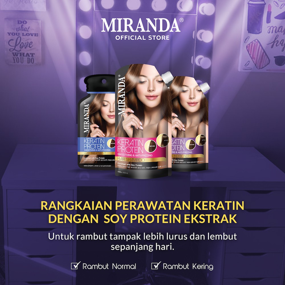 1. Miranda Keratin Protein Hair Shampoo 100ml Shampo yang dapat membersihkan dan membuat rambut kusut menjadi halus dan bersinar, kandungan Soy Protein extract membuat rambut lebih mudah diatur dan ditata. POM NA11181002419