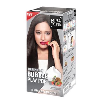 Miratone Bubble Playpop, pewarna rambut permanen dengan tipe busa yang mudah digunakan dan mudah diratakan hingga ke seluruh bagian rambut. Net Content : 15ml + 80ml + 40ml