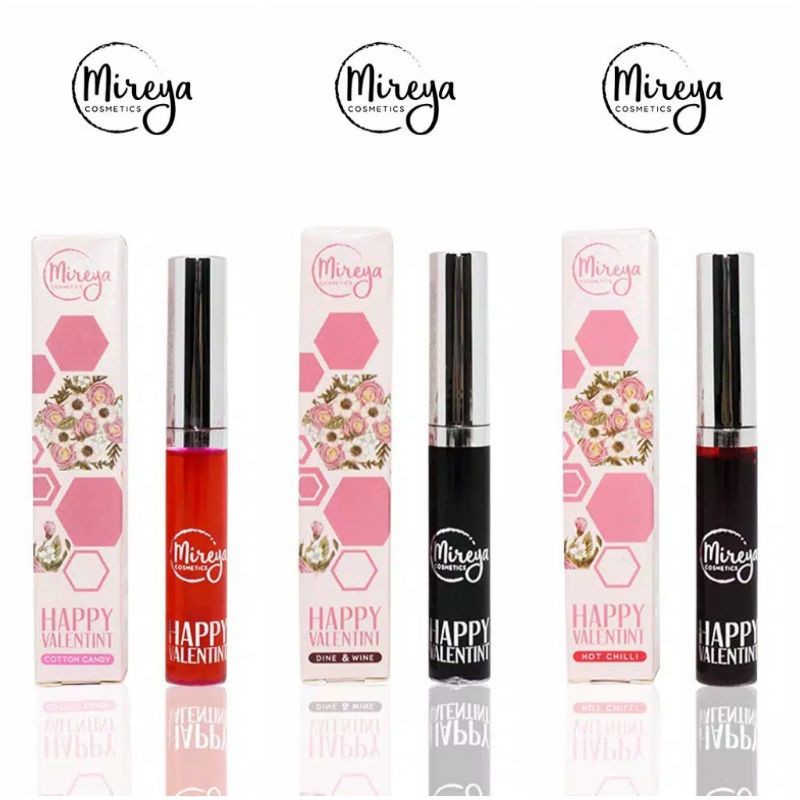 Mireya Liptint Happy Valentint_x000D_ _x000D_ Barang 100% asli dari Mireya Cosmetics_x000D_ Garansi uang kembali 100% jika produk kami tidak asli_x000D_ Semua produk Mireya telah lulus uji dan bersertifikat BPOM._x000D_ _x000D_ Cara Pemakaian :_x000D_ BIBIR : Oleskan Liptint mulai dari bagian dalam bibir dengan cara membuat dot-dot kecil dan segera ratakan dengan jari ke seluruh area bibir._x000D_ PIPI : oleskan tiga dot-dot kecil di Area pipi dan segera ratakan. _x000D_ _x000D_ COTTON CANDY : BPOM NA11181304513_x000D_ HO CHILLI : BPOM NA11181304514_x000D_ DINE & WINE : BPOM NA11181304155_x000D_ _x000D_ Netto : 4.5 ml