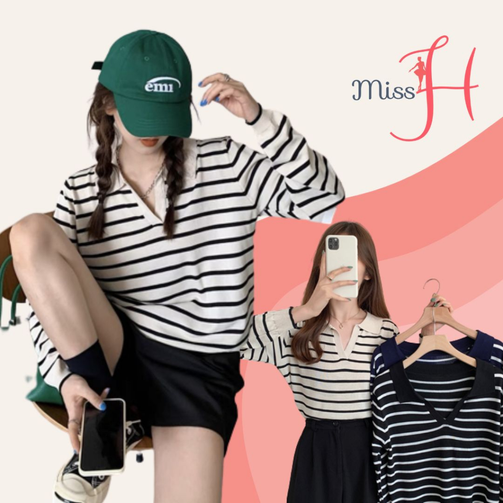 Detail Miss H ~ 267 Pakaian Wanita Inner Rajut Premium Lengan Panjang Import Bahan Adem Baju Wanita Sweater Wanita Motif Garis Belang