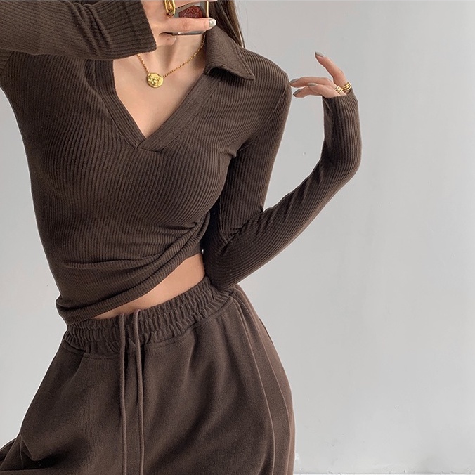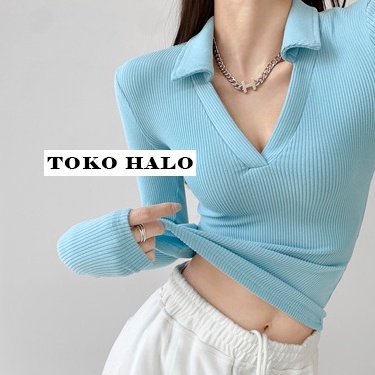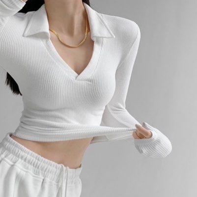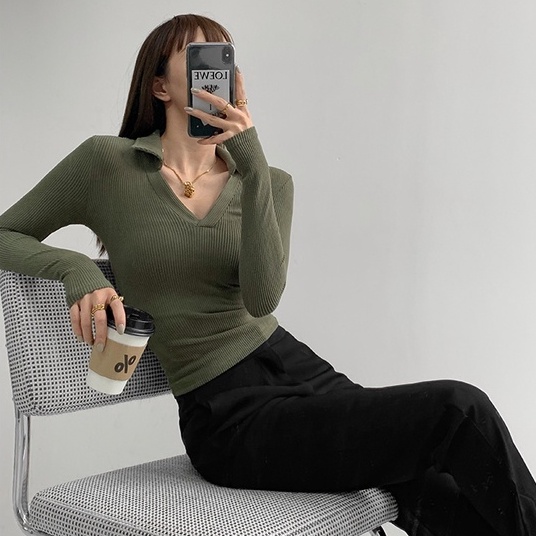 Detail 【MISSHONEY】V-Neck Long Sleeve Ribbed Basic Polo 7304 (S/M/L)