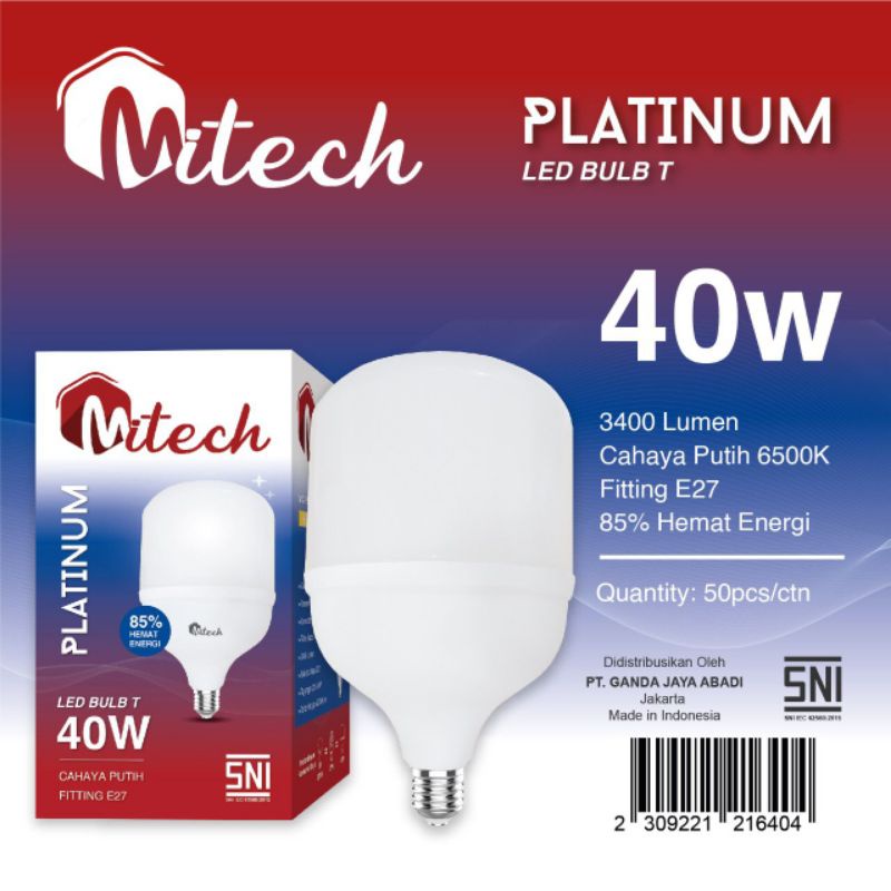 LAMPU LED MITECH PLATINUM LAMPU LED T BULB 40W WATT : 40 WATT FITTING: E27 LUMEN : 3400 TEGANGAN : 220-240V, 50/60HZ PILIHAN WARNA CAHAYA: -CAHAYA PUTIH / COOL DAYLIGHT 6500K -CAHAYA KUNING / WARM WHITE 3000K Cahaya langsung hidup secara maksimal, ramah lingkungan tanpa merkuri/radiasi. Untuk penggunaan di dalam ruangan, cover yang tahan benturan. Dapat beroperasi dalam tegangan 220-240V. Frekuensi 50-60Hz. Dan dapat beroperasi pada factor daya >0.9, CRI > 80, sudut cahaya 220 derajat.