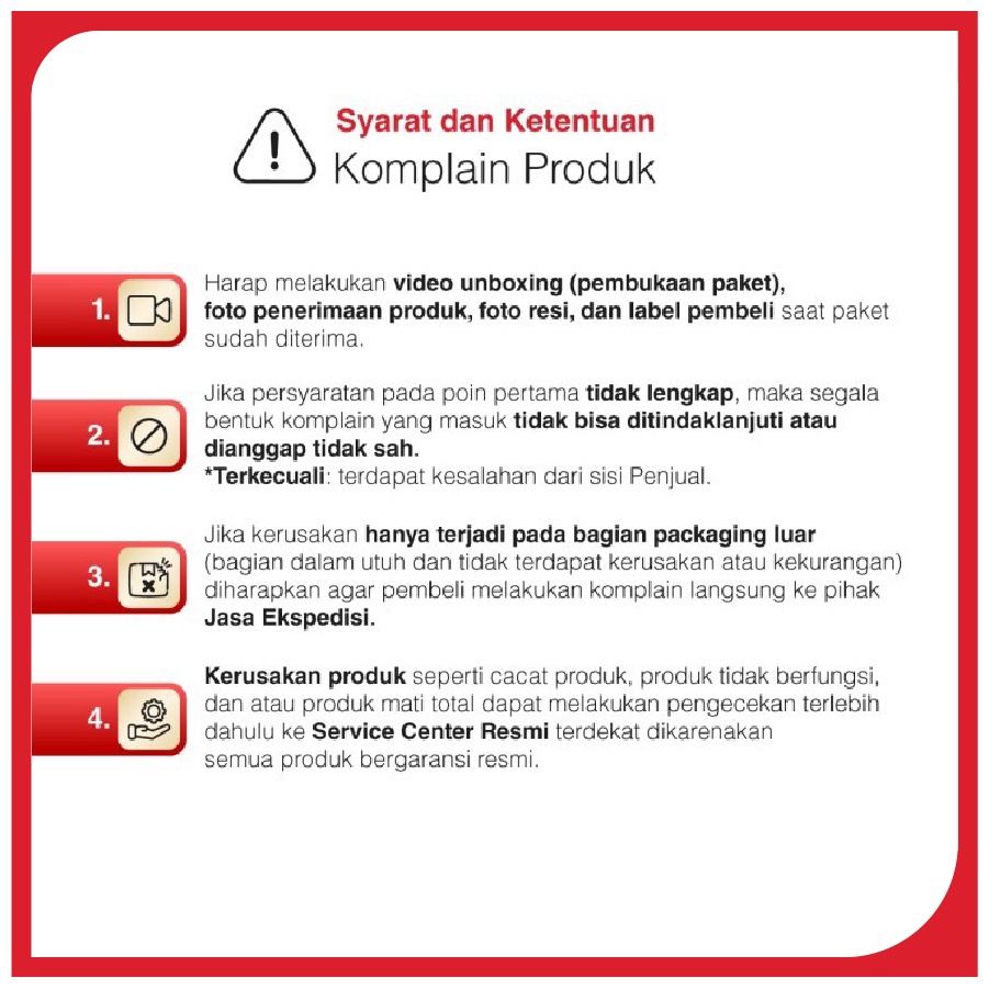 Syarat & Ketentuan Komplain Produk: 1. Mohon untuk melakukan Video Unboxing (Pembukaan Paket), foto penerimaan produk, foto resi dan label pembeli saat paket sudah berhasil diterima. Sehingga jika ada kerusakan, kekurangan produk/hadiah, atau ketidaksesuaian produk yang diterima, bisa dilakukan validasi melalui kelengkapan tersebut. 2. Jika tidak ada bukti atau hanya memiliki salah satu dari syarat kelengkapan tersebut, maka mohon maaf, segala bentuk komplain yang masuk tidak bisa ditindaklanjuti atau dianggap tidak sah. *Kecuali: Memang ada kesalahan dari sisi Penjual 3. Jika terdapat kerusakan packaging hanya pada bagian luar (bagian dalam utuh, dan tidak terdapat kerusakan/kekurangan pada produk, dll) yang disebabkan dari penanganan pihak jasa ekspedisi yang kurang baik, diharapkan agar pembeli bisa melakukan komplain langsung ke pihak Jasa Ekspedisi. 4. Kerusakan produk seperti cacat produk, produk tidak berfungsi atau produk mati total diwajibkan untuk dapat melakukan pengecekkan lebih lanjut ke Service Center Resmi terdekat dikarenakan semua produk bergaransi resmi.