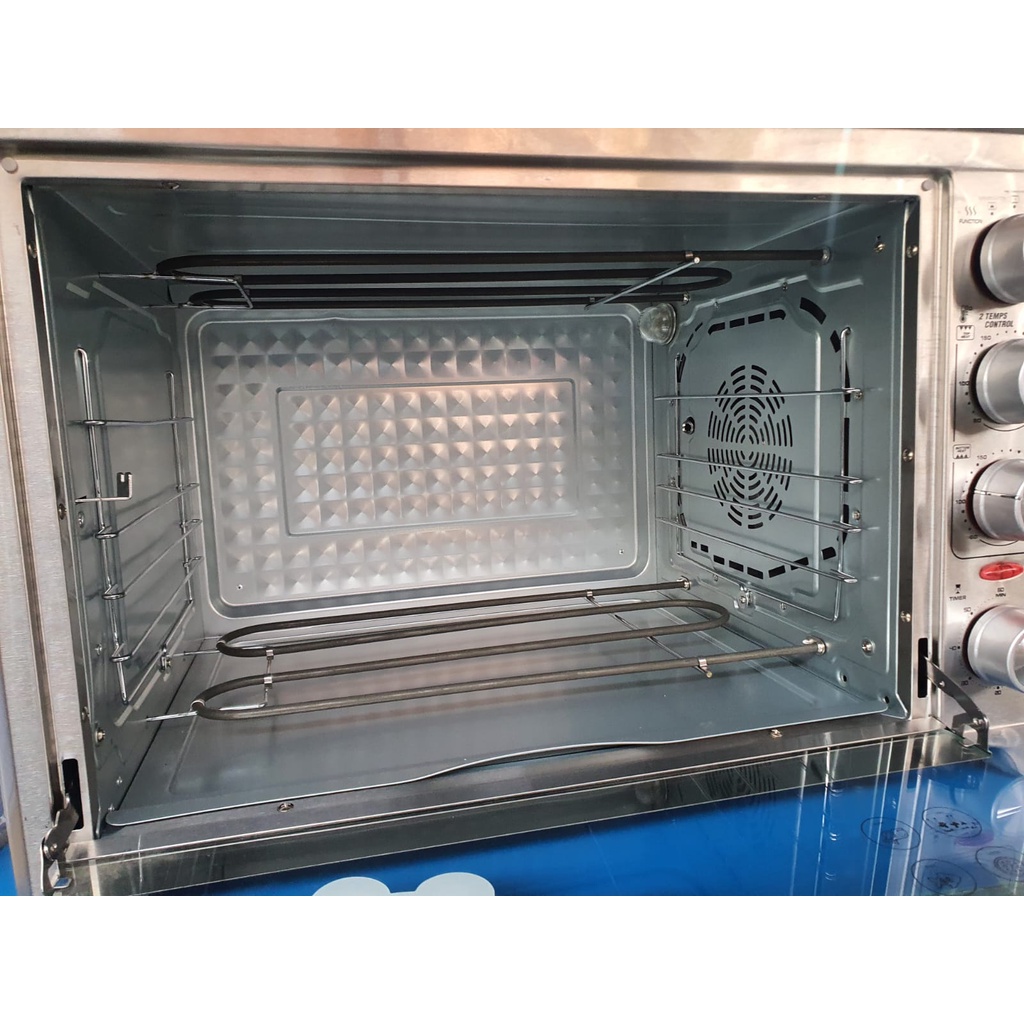 Spesifikasi: - Kapasitas lebih besar: 65 liter - Teknologi Diamond Cavity untuk hasil panggangan matang merata - Full Stainless & Anti finger touch body + double stainless steel element body - Termostat ganda untuk pengaturan suhu terpisah pemanas atas dan bawah - Kipas SUPER BESAR untuk panas lebih merata (Big Convection) - Dilengkapi dengan lampu - Warna: Silver - Pengaturan suhu 100°C -250°C, dilengkapi dengan 4 elemen panas - Daya 900 watt untuk 1 pemanas, 1.800 watt untuk 2 pemanas - Pengaturan waktu hingga 60 menit + bell ring