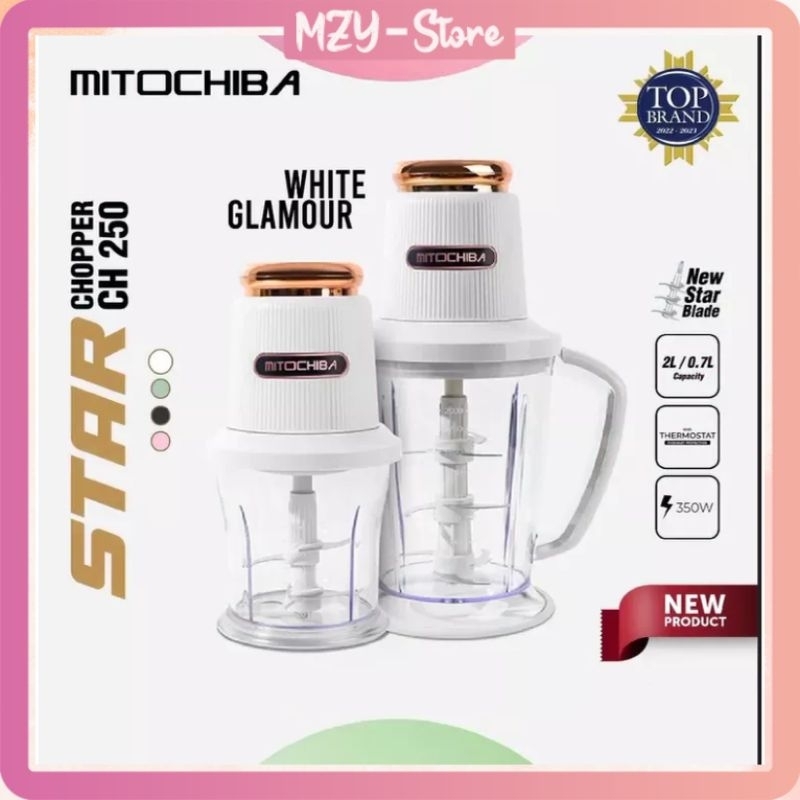 Star Chopper CH-250 2 Liter dan 700 ml, mampu menggiling daging hingga halus, bumbu--bumbu dapur, membuat aneka bakso hingga MPASI Anak, sangat cocok untuk segala keperluan dapur. . Kegunaan Chopper Mitochiba: *menggiling bumbu2 dapur *menggiling halus daging sapi/ayam/ikan *menghaluskan es batu *mpasi anak *mengocok telur putih *membuat juice *membuat Bakso *Selai kacang, strawberry dll