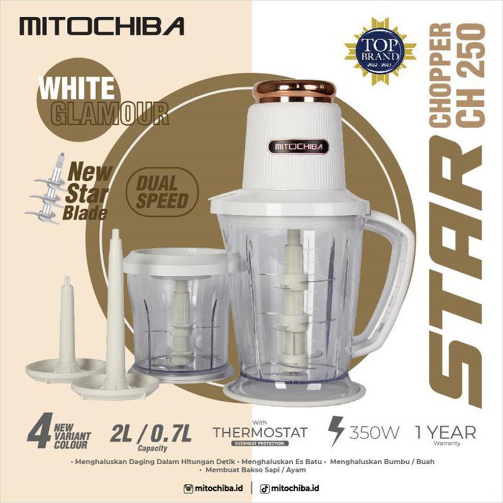 Star Chopper CH-250 2 Liter dan 700 ml, mampu menggiling daging hingga halus, bumbu--bumbu dapur, membuat aneka bakso hingga MPASI Anak, sangat cocok untuk segala keperluan dapur. . Kegunaan Chopper Mitochiba: - menggiling bumbu2 dapur - menggiling halus daging sapi/ayam/ikan - menghaluskan es batu - mpasi anak - mengocok telur putih - membuat juice - membuat Bakso - Selai kacang, strawberry dll Tingkat Kecepatan Chopper : 2 Speed + Pulse