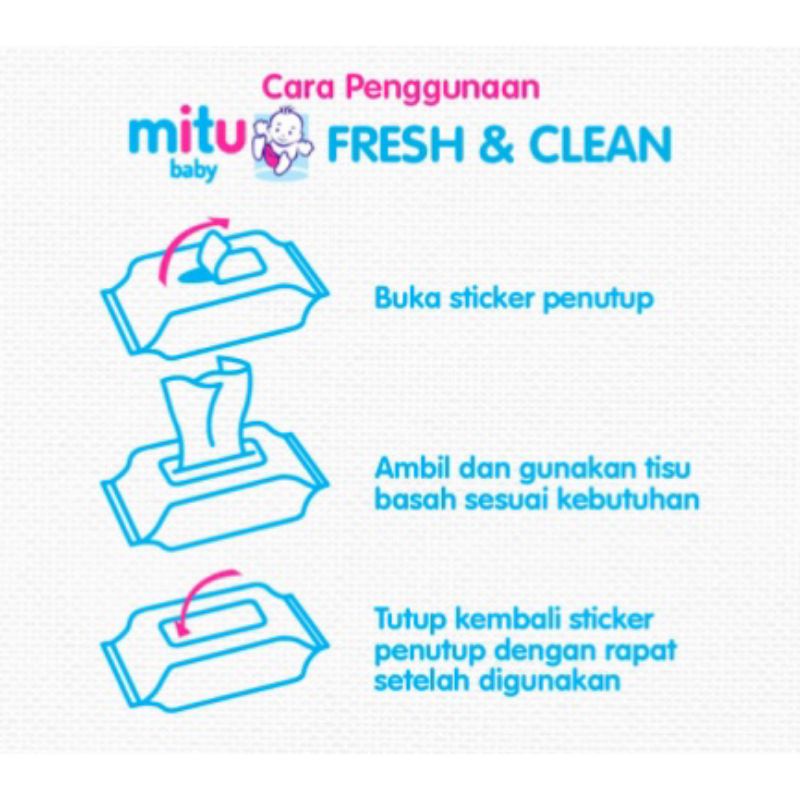 Tissue basah yang terbuat dari bahan-bahan yang sesuai dengan kebutuhan perkembangan dari kulit bayi. Tissue basah ini mampu melembabkan kulit bayi, sehingga tetap lembut dan sehat. Mitu Fresh n' Clean mengandung ekstrak chrysanthemum yang menjaga kulit bayi dari iritasi. Sangat cocok menjadi pilihan untuk kebutuhan bayi Anda.