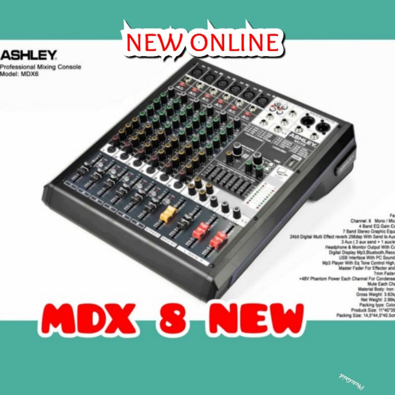 Spefikasi MIXER MDX8 ASHLEY ORIGINAL 8CHANNEL Fader 60mm With digital display mp3 usb flasdick mps input With record function usb Dual twelve band level display main output 3 aux 2 send 1oux pre 3 band equaliser eq each channel Effect reverb 24Bit 256dsp With blueooth conected Record earphone Monitor autput Phantom power Mute each channel Barang original pt ashley garansi resmi Kwalitas sangatlah bagus , bos bos