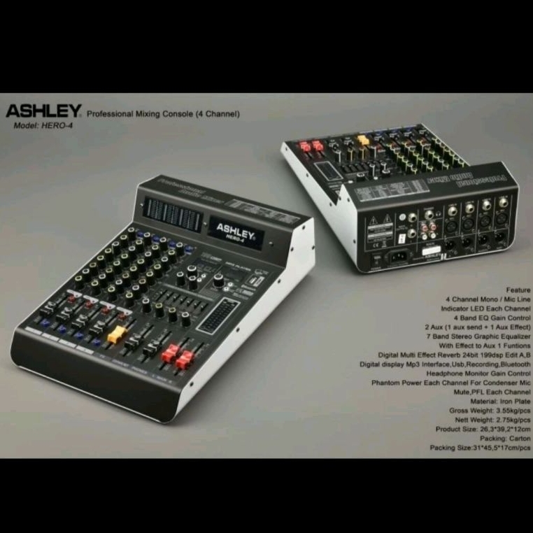 Mixer Ashley Hero 4 Channel Original Multi Effect 199dsp Specifications Channel 4 mono 4 Band EQ Frequency Each Channel 2Aux Send to Effect Volume Control Digital Multi Effect 199 Edit A, Edit B 7 Band Stereo Graphic Equaliser Digital Display mp3 interface, Usb, Recording, Bluetooth Headphone Monitor Gain Control Mute, PFL Switch Each Channel Insert On Each Channel Led Peak Each Channel + 48V Phantom Power Each Channel Garansi 1 Tahun Ashley