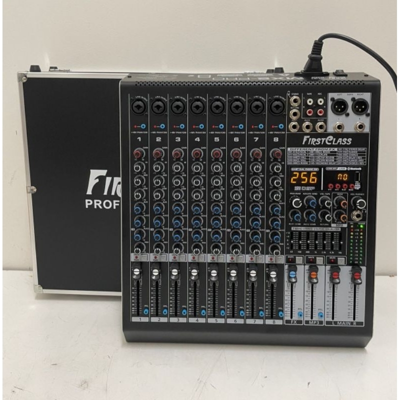 FEATURE: CHANNEL: 8 MONO / MIC LINE / INSERT 3 BAND ACTIVE EQ (HIGH,MID,LOW) PHANTOM POWER FOR STUDIO CONDENSOR MIC 7 BAND STEREO GRAPHIC EQUALIZER DIGITAL DISPLAY MP3, BLUETHOOTH,RECORDING DIGITAL DISPLAY 256 DSP EFFECT 24BIT DIGITAL MULTI EFFECT REVERB 40Hz WITH PRAMETER 256 DSP WITH SEND TO AUX 1,2 &3 3 AUX ( 2 AUD SEND + AUX/FX SEND) HANDPHONE & MONITOR OUTPUT WITH CONTROL USB MP3 PLAYER WITH 2 BAND EQ TONE HI&LOW MASTER FADER FOR EFFECT AND MP3 MUTE, PFL EACH CHANNEL