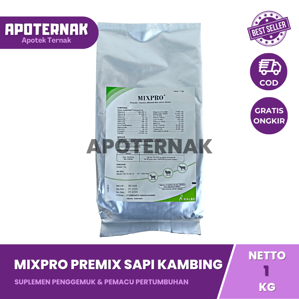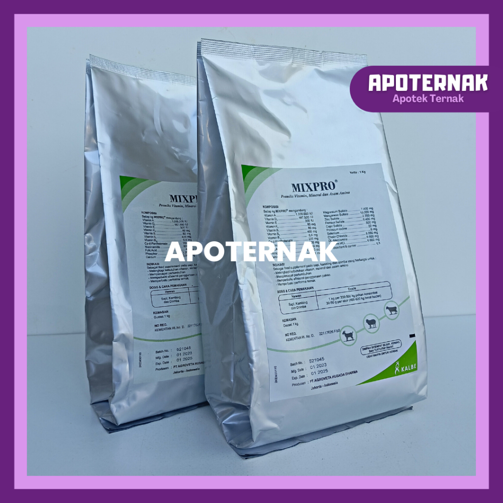 MIXPRO merupakan suplemen tambahan pakan Sapi dan Kambing yang terdiri dari Mineral Vitamin Asam Amino dan Probiotik.