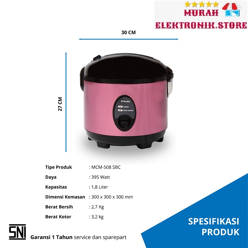 SELAMAT DATANG JURAGAN DI TOKO ONLINE KAMI MURAH ELEKTRONIK STORE MURAH ELEKTRONIK STORE MENJUAL PRODUK-PRODUK ELEKTRONIC DAN KEBUTUHAN RUMAH TANGGA ANDA DENGAN HARGA MURAH,PRODUK YANG BERKUALITAS,100% ASLI ORIGINAL DAN BERGARANSI RESMI. Magic Warmer Plus Miyako MCM-508 SBC Merupakan penanak nasi dengan fungsi 3 in 1 yaitu sebagai pemasak nasi, mengukus dan menghangatkan masakan. Magic warmer ini dilengkapi dengan panci NANOAL yang anti lengketnya 10x lebih tahan lamaaa serta bebas PFOA sehingga lebih awet, tahan lama dan aman untuk kesehatan. Memiliki 3 element pemanas dibagian atas, tengah dan bawah yang menjadikan nasi matang lebih sempurna dan tahan hangat lebih lama.