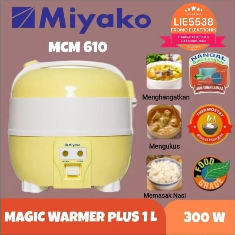 * Kapasitas 1 L * Panci innerpot nanoal (anti lengket) * Body anti karat & penyok * Fungsi 3in1 (memasak, menghangatkan dan mengukus) * Dilengkapi magic tonjolan (menjaga nasi tetap enak) * Daya masak 300 W * Daya penghangat 45-48 W * Dilengkapi dengan gelas ukur, pengukus, sendok nasi dan kartu garansi * Garansi resmi Miyako 1 tahun