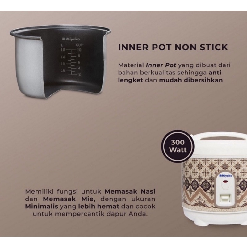 Fungsi Utama : - Memasak Nasi atau Mie - Kapasitas Nasi 0,63 L - Daya 300 Watt - Tegangan 220 VAC-50 Hz - Panci aluminium coating teflon ( anti lengket )