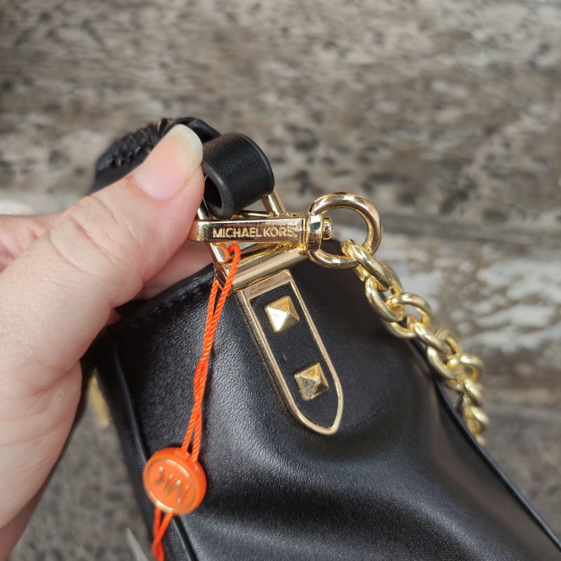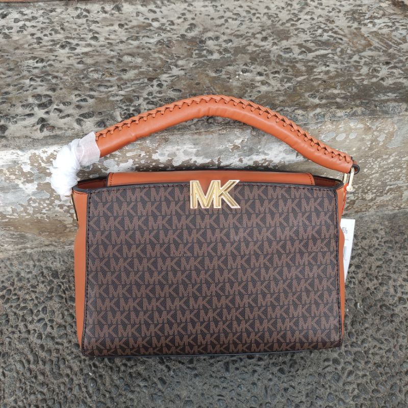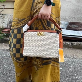 MK Karlie Logo Satchel Uk. 27x10x18 Ada tali panjang. no seri. furing satin print Mk. Ada barcode. acc gold