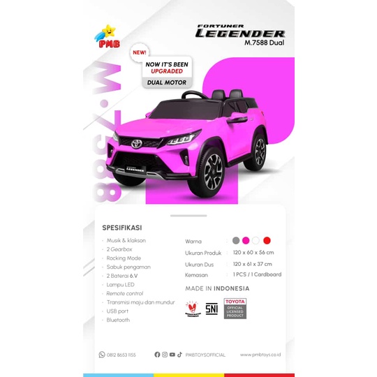“Kualitas terbaik, tetap yang ada Bintangnya” Fitur : FITUR BARU 2 MOTOR dengan 2 BATTERY 6V, Anti Kejut, Sabuk Pengaman, Lampu LED, Music dan Klakson, USB Port, Bluetooth, Transmisi Maju Mundur, Remote Bluetooth
