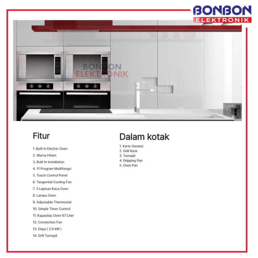 Fitur 1. Built In Electric Oven 2. Warna Hitam 3. Built In Installation 4. 11 Program Multifungsi 5. Touch Control Panel 6. Tangential Cooling Fan 7. 3 Lapisan Kaca Oven 8. Lampu Oven 9. Adjustable Thermostat 10. Simple Timer Control 11. Kapasitas Oven 67 Liter 12. Convection Fan 13. Daya ( 2.9 kW ) 14. Grill Turnspit