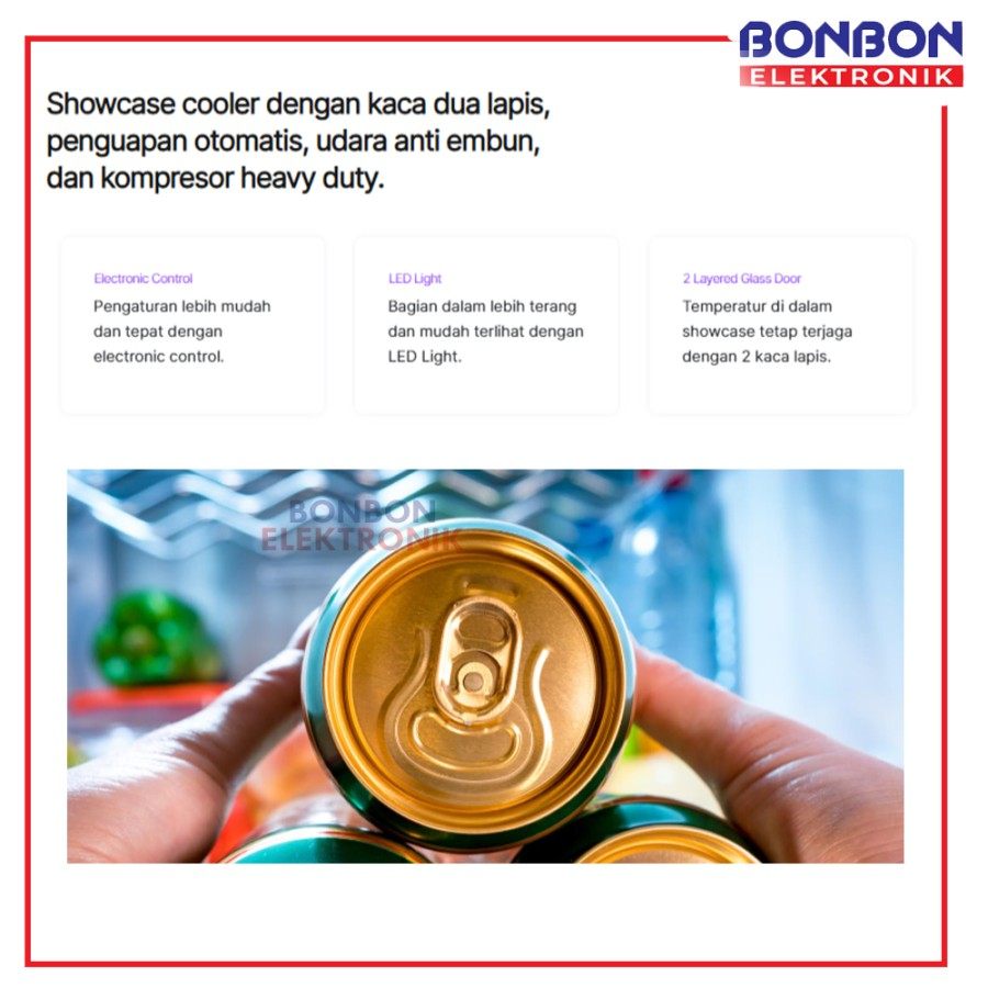 Showcase cooler dengan kaca dua lapis, penguapan otomatis, udara anti embun, dan kompresor heavy duty.
