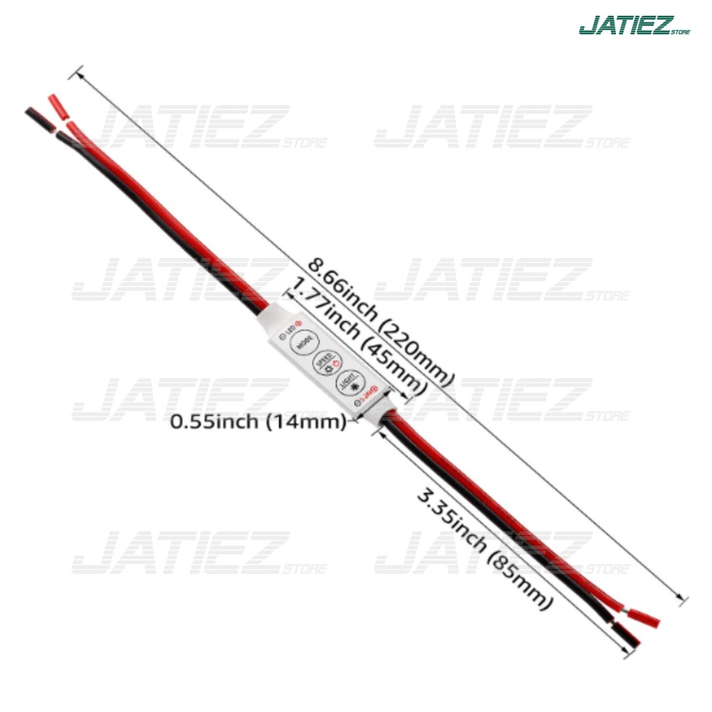 - Terdapat 3 tombol untuk mengatur LED (mode,kecepatan,kecerahan) - 6 Mode - 6 Speed - Voltage: 12-24V - Dimensions: 42*12*3(mm) - Protection class: IP65 - Autosave last mode memory (Penyimpanan Otomatis Mode Terakhir) pastikan instalasinya kenceng biar auto save berjalan dengan baik - kabel in 9cm, kabel out 9cm