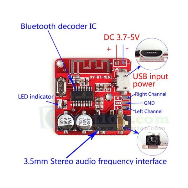 Definisi fungsi dan antarmuka: Spesifikasi antarmuka: ➢ catu daya Universal Micro USB 5V ➢3.7-5V Supply Pad: Konversi daya baterai lithium 3.7-5V eksternal ➢ Indikator LED: Lampu biru mode Bluetooth ➢ interface audio stereo 3,5 mm: Antarmuka standar 3,5 mm, keluaran speaker berupa stereo, , headphone, penguat sambungan dan perangkat lain