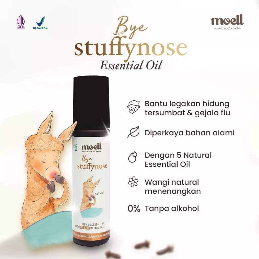 Moell Bye Stuffynose Natural Essential Oil merupakan Essential Oil yang diciptakan untuk membantu meredakan batuk,pilek dan hidung tersumbat pada baby. Essential Oil yang terbuat dari Full bahan natural yang aman untuk baby.