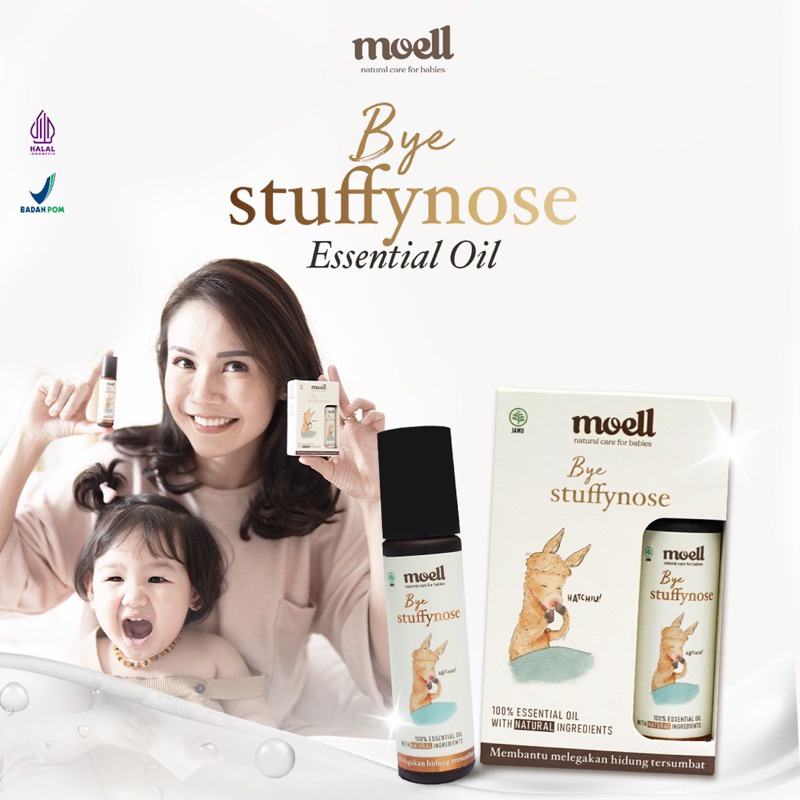 Moell Bye Stuffynose Natural Essential Oil merupakan Essential Oil yang diciptakan untuk membantu meredakan batuk,pilek dan hidung tersumbat pada baby. Essential Oil yang terbuat dari Full bahan natural yang aman untuk baby.