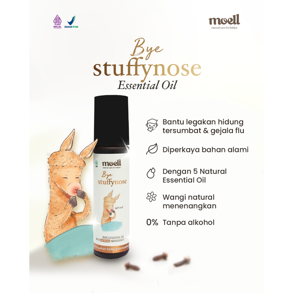 Moell Bye Stuffynose Natural Essential Oil merupakan Essential Oil yang diciptakan untuk membantu meredakan batuk,pilek dan hidung tersumbat pada baby. Essential Oil yang terbuat dari Full bahan natural yang aman untuk baby. ● Terdaftar BPOM sebagai Obat Tradisional ● Dengan 5 Natural Essential Oil ● Diperkaya Bahan Alami ● Alkohol Free