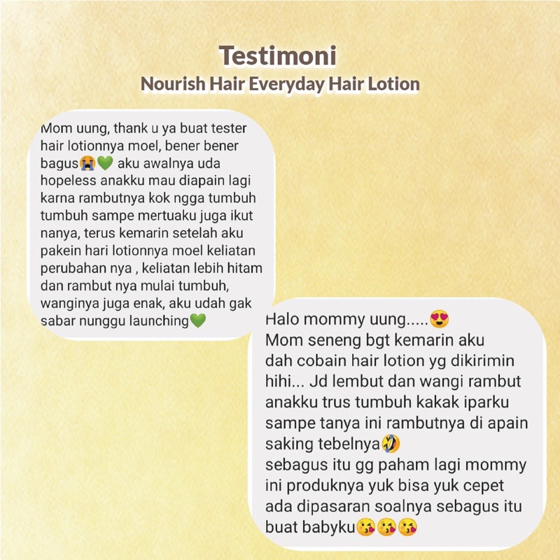 USP : —Packaging spray, lebih mudah digunakan. —Fresh scent. —Function -Menutrisi dan merangsang pertumbuhan rambut -Melembutkan rambut -Menjaga rambut tetap wangi —Cocok digunakan rutin setiap hari, dapat digunakan setelah keramas atau rambut kering —Dapat digunakan newborn —Teruji efektif tidak menimbulkan iritasi pada kulit kelapa bayi yang sensitif —Double Tested Formulation (Dermatologically tested dan Hypoallergenic tested)