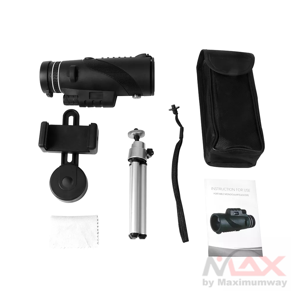 Spesifikasi MOGE Teropong Monokular Zoom 80x100 with Tripod Phone Clip - MG810 Material Bodi: Plastik Dimensi Monokular: 15.2 cm Diameter Lensa Mata: 2.1 cm Diameter Lensa Objek: 3.9 mm Lain-lain Tipe Prisma: BAK4 Sistem Prisma: Prisma Atap Sistem Fokus: Fokus Lensa Mata Bidang Pandang: 3000/9840 Meter