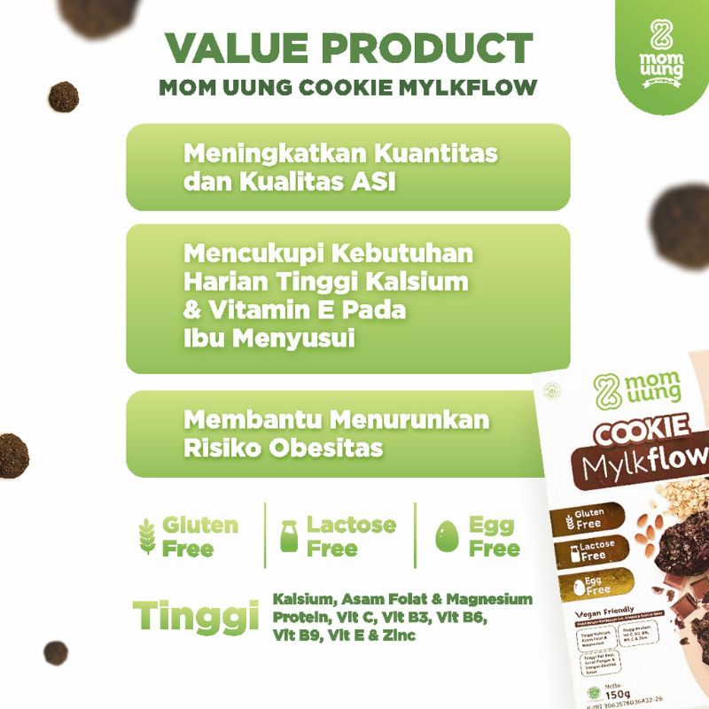 🥠KELEBIHAN MOM UUNG COOKIE MYLKFLOW ✔️ Gluten Free: Tidak mengandung protein gluten ✔️ Lactose Free: Tidak mengandung/menggunakan susu atau olahannya ✔️ Egg Free: Tidak mengandung telur ✔️ Vegan Friendly : Ramah dikonsumsi oleh vegetarian ✔️ Tinggi Kalsium, Asam Folat, dan Magnesium ✔️ Tinggi Protein, Vit C, Vit B3, Vit B6, Vit B9, Vit E, dan Zinc ✔️ Tinggi Zat Besi dan Serat Pangan ✔️ Terbuat dari Gula Kelapa dan gula stevia