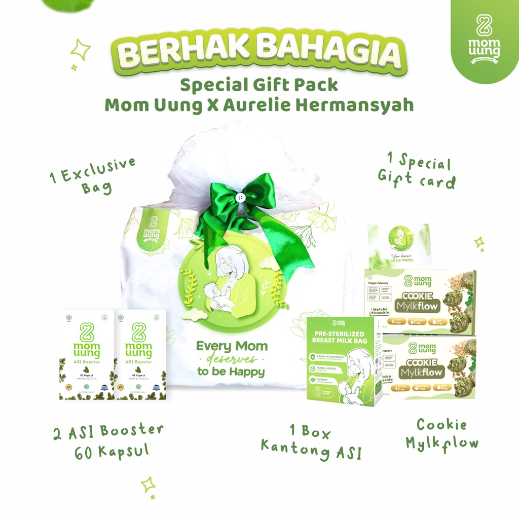 Mom Uung Special Gift Pack Berhak Bahagia : 2 pcs Mom Uung ASI Booster 60 Kapsul 2 pcs Mom Uung Cookie Mylkflow (choco / matcha) 1 pc Mom Uung Kantong ASI (isi 30 lembar, @100 ml) 1 pc Exclusive Bag 1 pc Special Gift Card