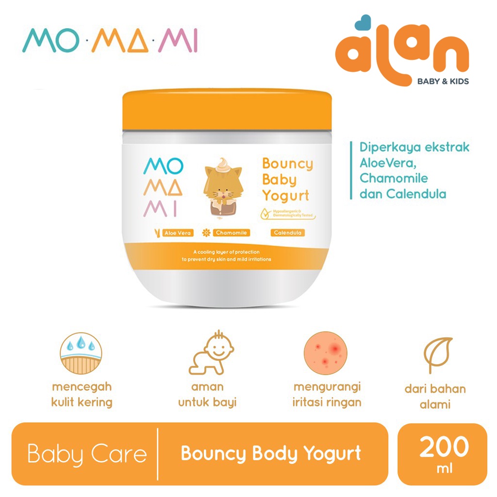 Momami Bouncy Baby Yogurt 200ml merupakan lotion body yogurt yang diformulasikan untuk melembabkan dan menghaluskan kulit bayi. Berfungsi untuk mencegah kulit kering serta meredakan iritasi ringan dengan bahan alami yang menyegarkan.