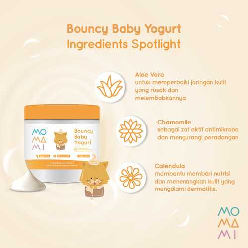 Momami Bouncy Baby Yogurt 200ml merupakan lotion body yogurt yang diformulasikan untuk melembabkan dan menghaluskan kulit bayi. Berfungsi untuk mencegah kulit kering serta meredakan iritasi ringan dengan bahan alami yang menyegarkan.