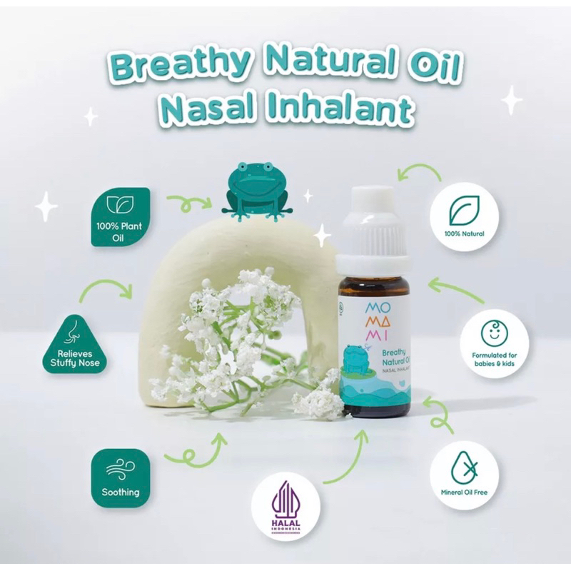 Momami Breathy Natural Oil di buat secara alami untuk menyegarkan dan melegakan pernafasan si kecil pada saat hidung tersumbat. Terdiri dari enam komposisi utama dengan fungsi masing-masing: 1. Eucalyptus Oil - Melegakan hidung tersumbat 2. Cajuput Oil & Clove Bud Oil - melegakan saluran pernafasan 3. Juniperberry Oil & Gandapura Oil - Antioksidan 4. Peppermint Oil - Aroma memberikan rasa nyaman dan tenang