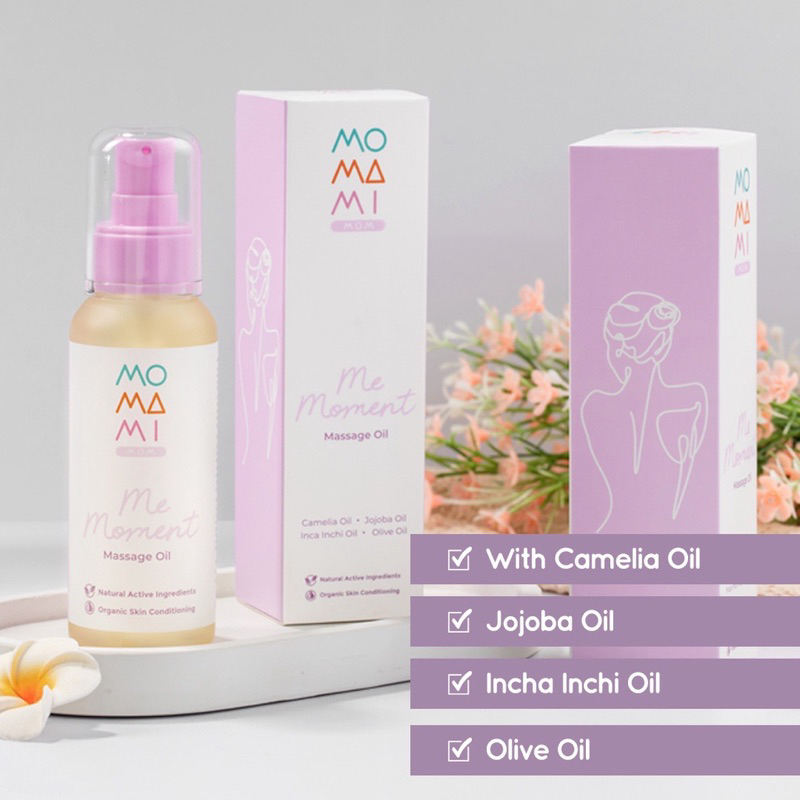 MOMAMI Me Moment Massage Oil memiliki kegunaan untuk: •Menenangkan dan melembapkan kulit ibu serta memperlancar peredaran darah dengan pijatan teratur •Pijatan dengan Massage oil dapat membantu menghilangkan rasa pegal dan membuat tubuh lebih rileks •Dapat memperlancar saluran susu yang tersumbat dengan pijat laktasi