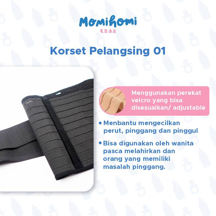Korset untuk membantu mengembalikan bentuk tubuh pasca melahirkan. Dengan bahan yang lembut dan tidak panas, korset Momi Homi efektif meratakan dan mengencangkan bagian perut dan pinggang. Korset ini juga bisa digunakan untuk mengatasi masalah sakit punggung atau pun sakit pinggang.