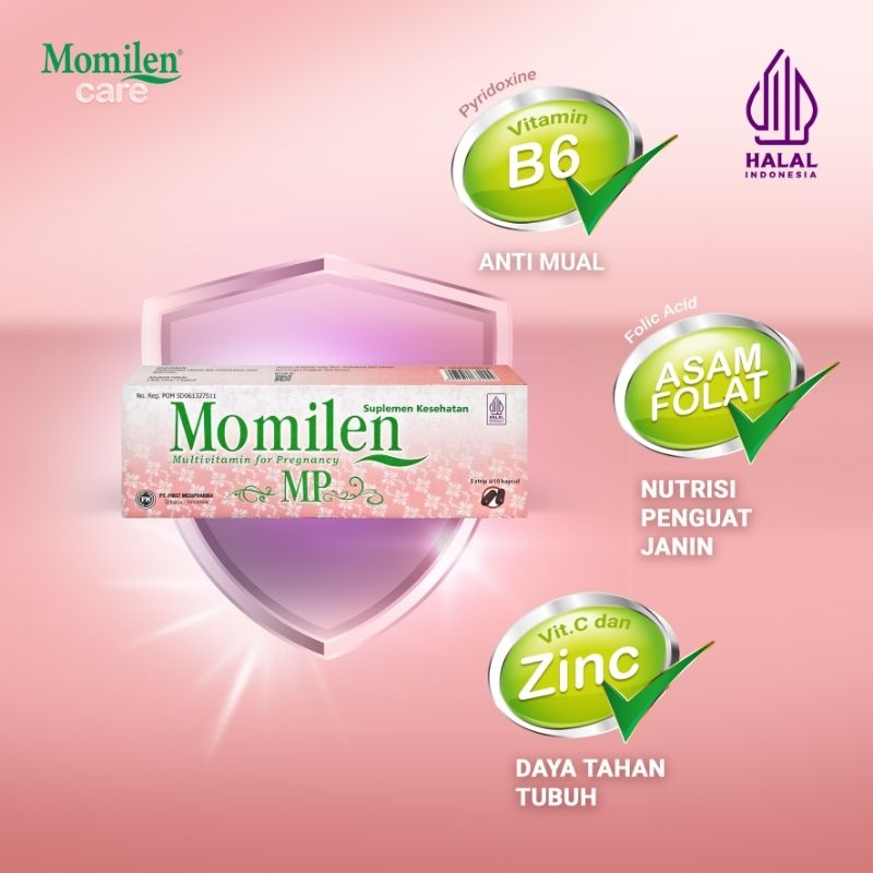 MOMILEN MP - MULTIVITAMIN FOR PREGNANCY Merupakan suplemen pendukung program kehamilan sejak dalam pebentukan benih (sperma) hingga pada masa kehamilan trimester kedua. Membantu mengurangi keluhan yang sering muncul, seperti mual, muntah, dan lesu. Digunakan untuk memenuhi kebutuhan vitamin dan kalsium selama masa kehamilan, membantu menguatkan janin hingga mengurangi resiko cacat bawaan selama trimester awal / tengah kehamilan.