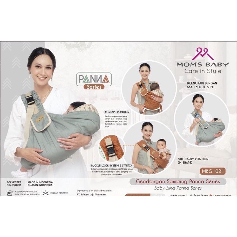 Moms Baby Gendongan Samping Panna Series - MBG1021 Warna : Dusty Green, Chocolate Brick NOTE : SILAHKAN CHAT ADMIN UNTUK KETERSEDIAAN WARNA Bahan : Twill PE 30s Ukuran : -Badan : 77x79cm -Topi : 40x17cm -Karet Tali punggung : 23cm, bisa elastis sampai 36cm -Tali punggung : 66x12 cm Kapasitas: Max 15 kg Keunggulan : -Terdapat penutup kepala (topi) yang dapat melindungi kepala bayi dari panas, angin atau cahaya yang silau -Lapisan dalam memakai kaos single knit yang lembut aman dan nyaman untuk kulit bayi. -Gendongan Samping ini memiliki tali yang kokoh, dilapisi busa, dengan pengaman kunci sodok yang dilengkapi dengan lock system. -Tali webbing dapat digunakan untuk mengatur panjang/posisi gendongan. -Bisa digunakan untuk bayi usia mulai 0 bulan (newborn). -Kapasitas bobot maksimal bayi hingga 15 kg. -Terdapat karet kerut di sekeliling badan gendongan untuk menjaga bayi agar nyaman dalam gendongan. -Terdapat saku untuk menyimpan botol susu