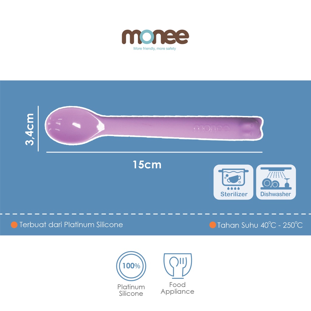 Sendok multifungsi (sendok & teether) berbahan platinum silicone yang sangat lentur sehingga aman dan nyaman digunakan si kecil. Higienis karena dilengkapi dengan spoon case s (dijual terpisah).