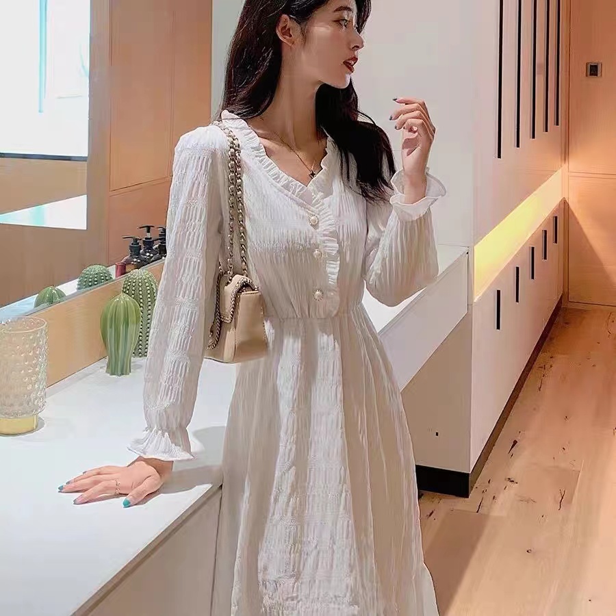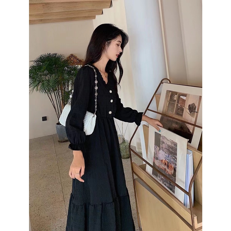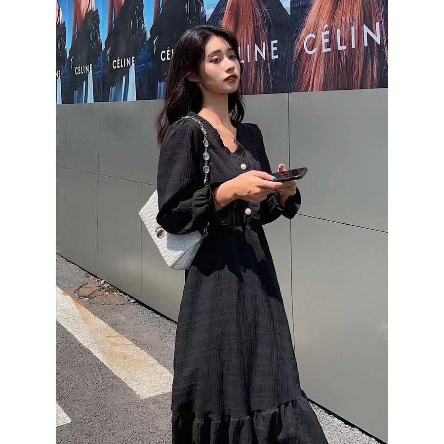 Detail Monica Gaun lengan panjang Prancis gaya Hepburn 2023 baru dengan rok panjang pelangsing pinggang
