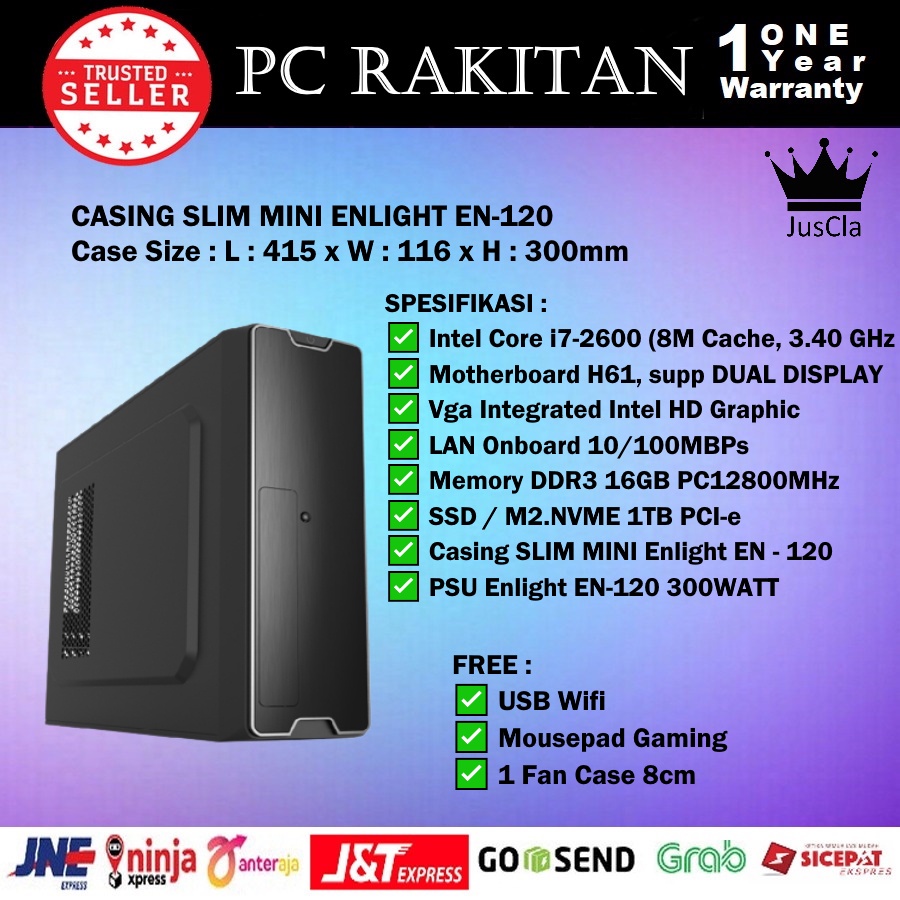 SPESIFIKASI : ✅ Intel Core i7-2600 (8M Cache, 3.40 GHz Up To 3.8 Ghz) ✅ Motherboard H61, supp DUAL DISPLAY ✅ Vga Integrated Intel HD Graphic ✅ LAN Onboard 10/100MBPs ✅ Memory/RAM ==> PILIH VARIAN saat CHECKOUT / ORDER ✅ SSD/M2.NVME ==> PILIH VARIAN saat CHECKOUT / ORDER ✅ Casing SLIM MINI Enlight EN - 120 ✅ PSU Enlight EN-120 300WATT