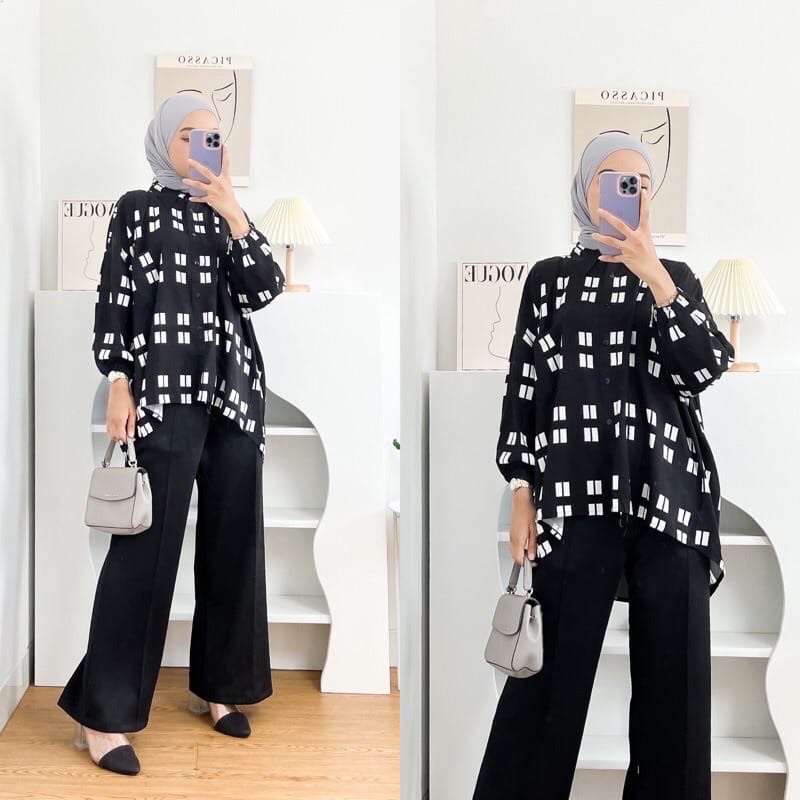 Monochrome Blouse Rayon Jumbo Kemeja Oversize MotifMonochrome Blouse Rayon Jumbo Kemeja Oversize Motif